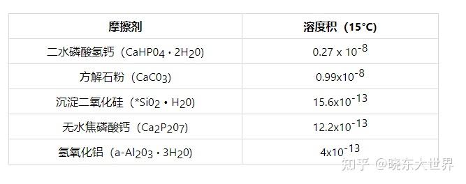 要求摩擦劑不溶于水或微溶于水,此為堅(jiān)持牙膏化學(xué)動(dòng)搖性的一個(gè)重要目的。常用摩擦劑的溶度積如表3-1-1所示。